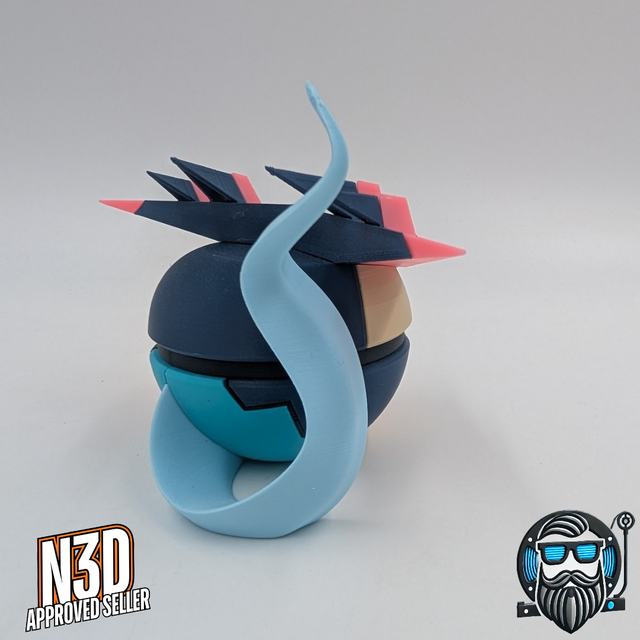 Cette Pokéball décorative Lanssorien (Dragapult) imprimée en 3D revisite l’univers Pokémon avec un design dynamique inspiré du mythique Pokémon Dragon/Spectre. Créée par N3D et fabriquée par Barbu 3D Print, elle se distingue par ses lignes anguleuses, ses couleurs bleu profond et rose néon, ainsi que sa queue spectrale emblématique pour un rendu moderne et ultra détaillé.