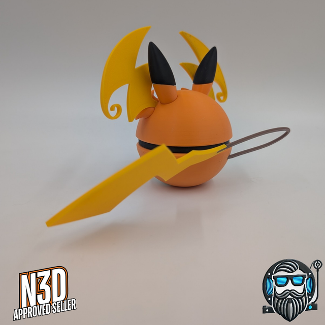 Cette Pokéball décorative Raichu imprimée en 3D revisite l’univers Pokémon avec un design audacieux inspiré du célèbre Pokémon Électrik. Créée par N3D et fabriquée par Barbu 3D Print, elle associe passion geek, qualité artisanale et finitions soignées pour un rendu unique.