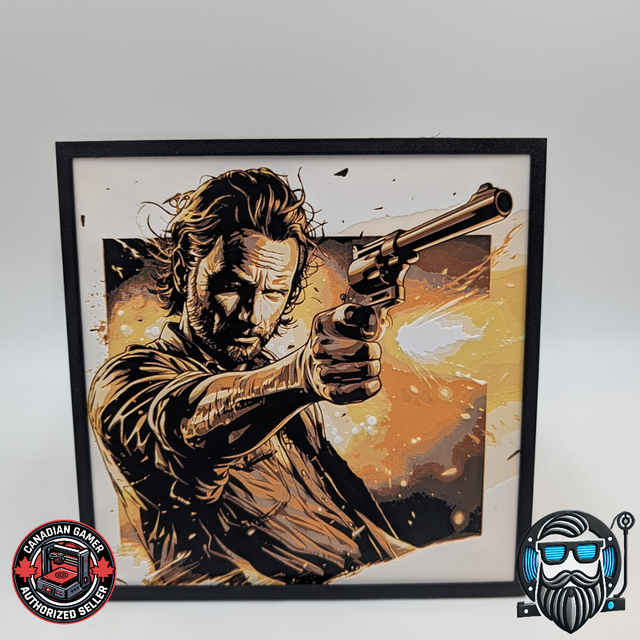 Plongez dans une ambiance intense et cinématographique avec cette impression 3D Hueforge au style puissant et contrasté. Ce visuel fort, inspiré des univers post-apocalyptiques et comics, apporte un véritable caractère à votre décoration geek.