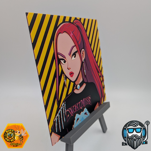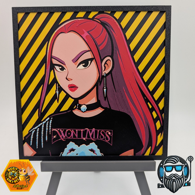 Transformez votre espace avec cette plaque décorative imprimée en 3D, conçue par Busy Kiki Bee et fabriquée par Barbu 3D Print. Ce visuel percutant met en scène un personnage féminin au style affirmé, sublimé par des contrastes forts et des lignes graphiques inspirées de la pop culture et de l’univers gaming. Une pièce décorative qui impose son caractère et attire immédiatement le regard.