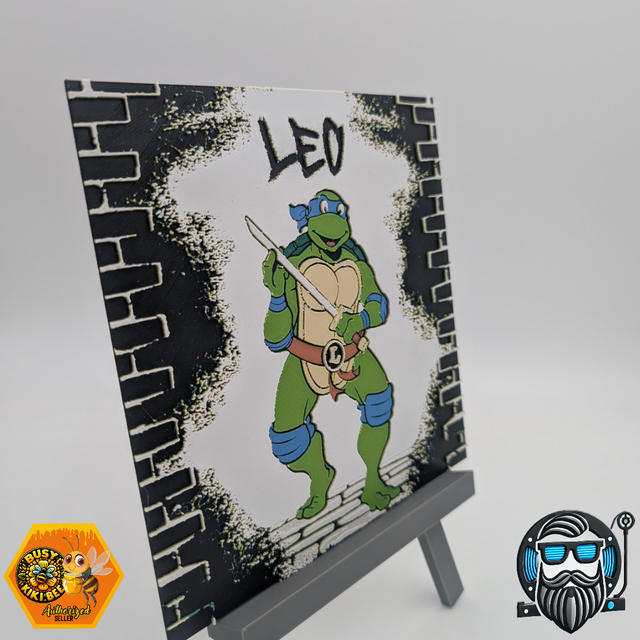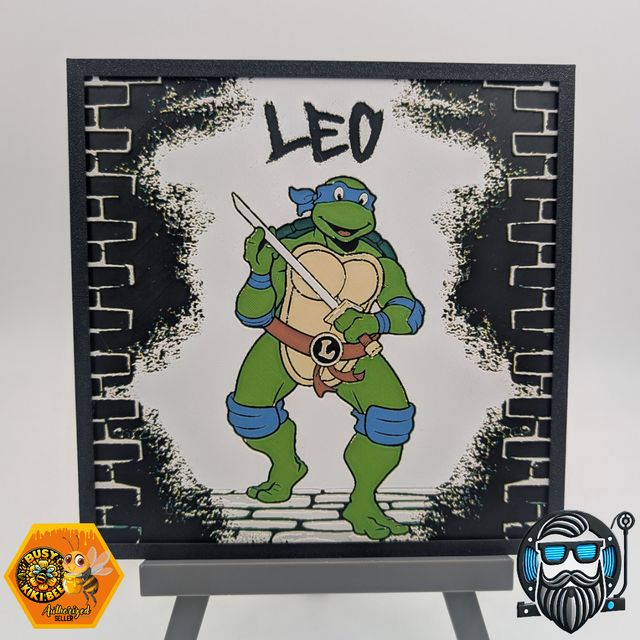 Cette création Hueforge met en scène une Tortue Ninja version “Leo”, surgissant d’un mur façon graffiti urbain avec effet brique et profondeur saisissante. Le design signé Busy Kiki Bee est sublimé par la fabrication artisanale de Barbu 3D Print pour un rendu texturé unique et ultra immersif.